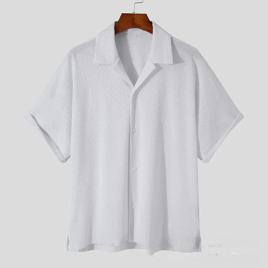 Style Casual Simple New Men's Solid Blouse Streetwear Male Loose Comfortable Pleated Short Sleeve Shirts