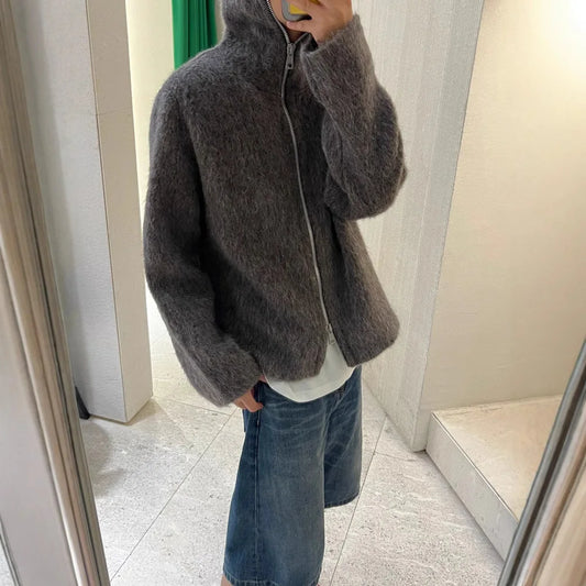 Style Zipper Hoodie Men's Open Cardigan Wide Fit Couple Knitwear Casual Loose Wool Pullovers