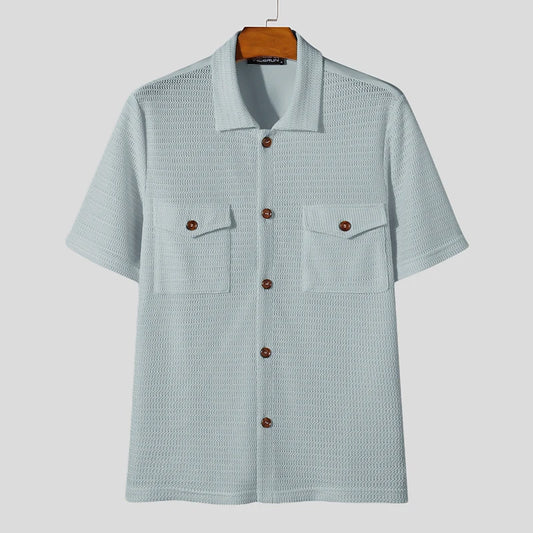Stylish Streetwear Style Tops Men's Mesh Hollow Double Pocket Design Shirts Casual Solid Short Sleeved Blouse S-5XL