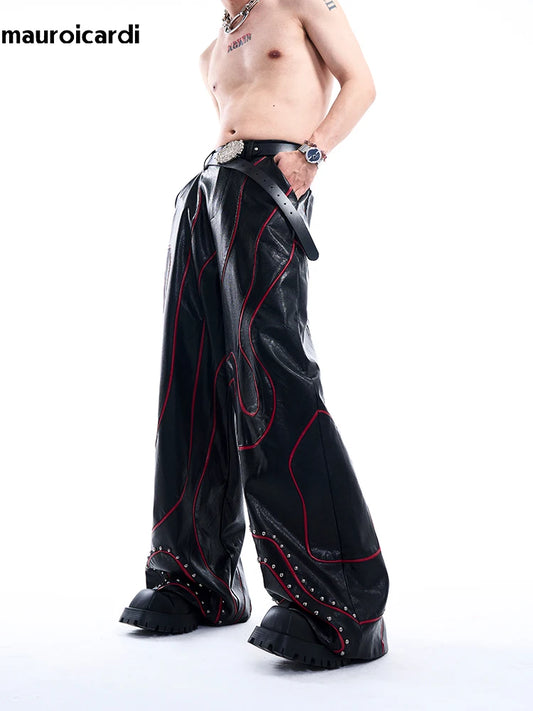 Spring Cool Patchwork Pu Leather Wide Leg Pants for Men Rivet Luxury Designer Heavy Industry punk Style Clothes 2025