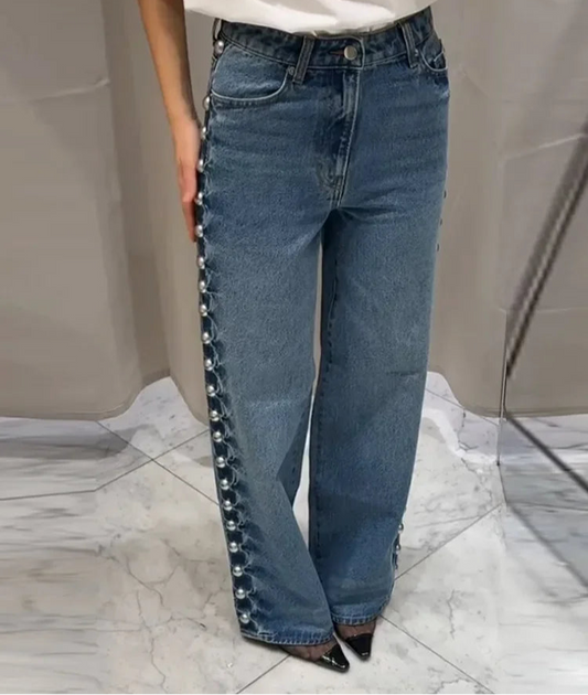 Casual Bead Jean Women Loose High Waisted Pockets Zipper All-match Straight Leg Trouser Female 2025 Y2k High Street Lady Outwear