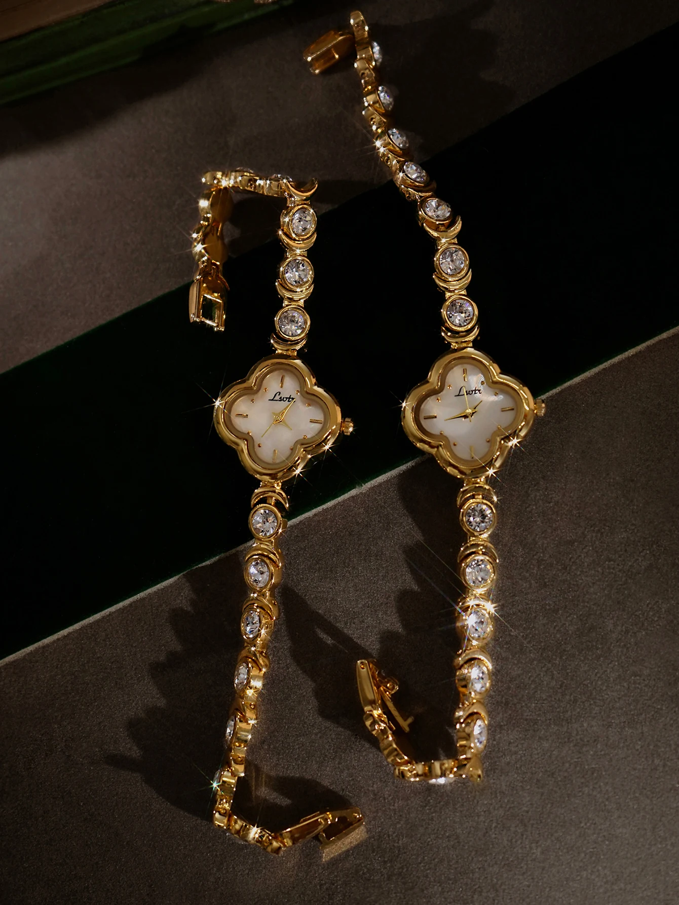 1 Piece of New High-End French Luxury Fashion and Elegant Women's Watch Rhinestone Inlaid Four-Leaf Clover Shape Surface 30m Waterproof Quartz Watch Rhinestone Mother-Of-Pearl Dial Women's Watch Gorgeous Romantic Retro Elegant Women's Watch for Daily W...