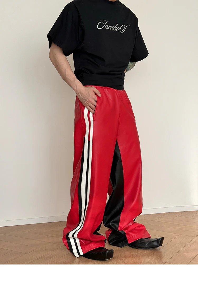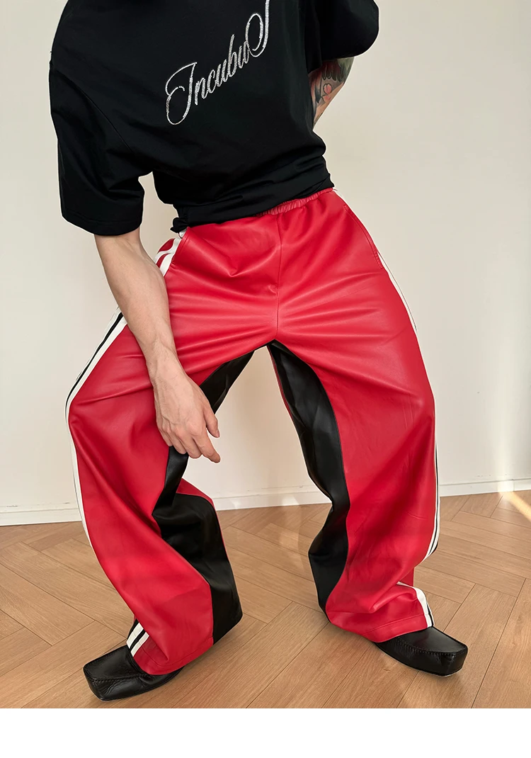 Spring Autumn Long Loose Casual Baggy Color Block Pu Leather Pants Men Elastic Waist Wide Leg Trousers Streetwear