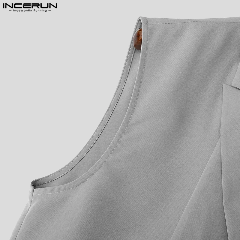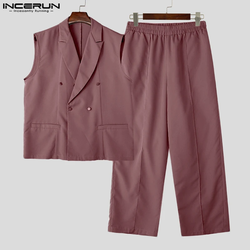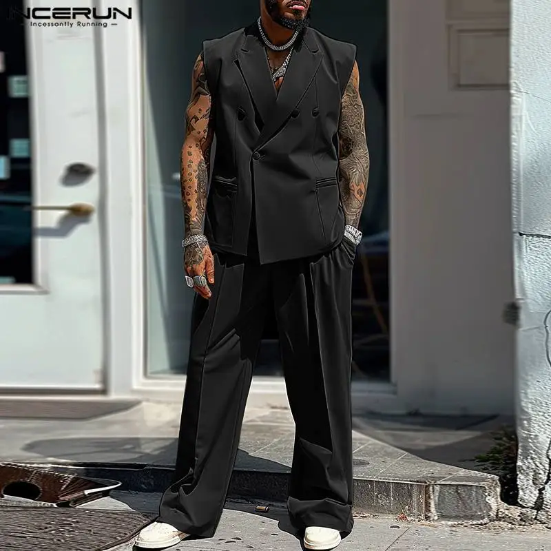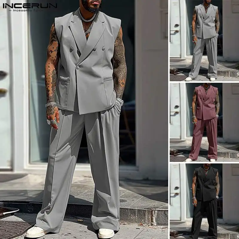 Men's 2024 INCERUN American Style Solid Color Sleeveless Sets Casual Insert Pocket Two-piece Suits Street Fashion Oversize