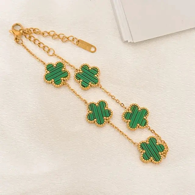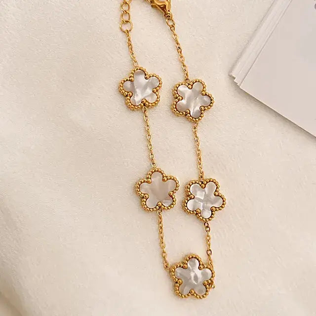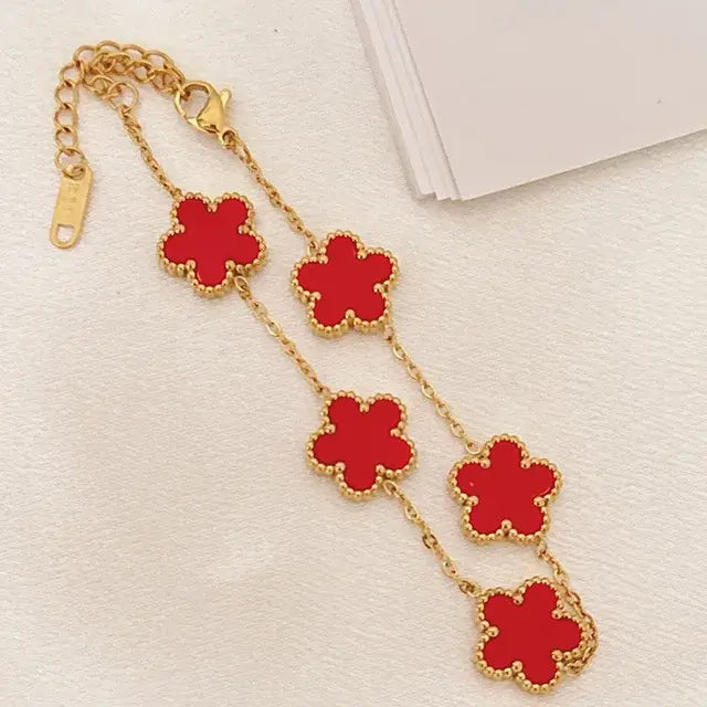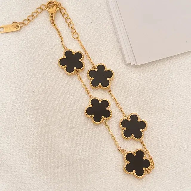 New Aniola Clover Luxury Five Leaf Flower Stainless Steel Pendant Bracelet – a symbol of elegance and sophistication. Crafted with meticulous attention to detail, this bracelet features a stunning five-leaf flower pendant made from high-quality stainless steel. The delicate design adds a touch of luxury to any outfit, making it perfect for both casual and formal occasions.