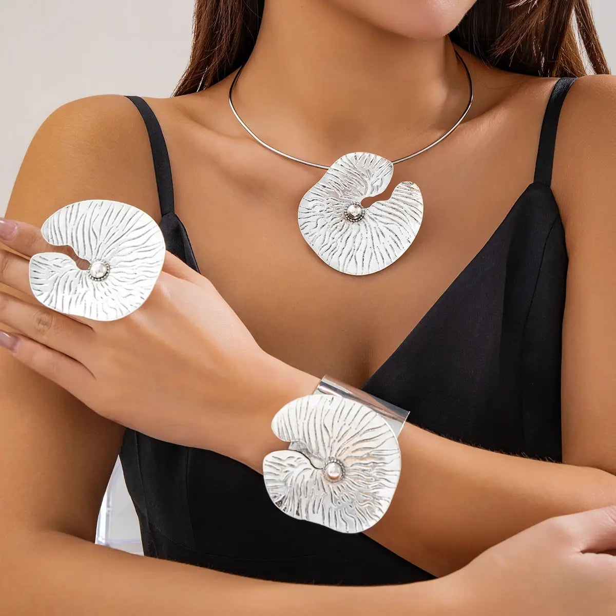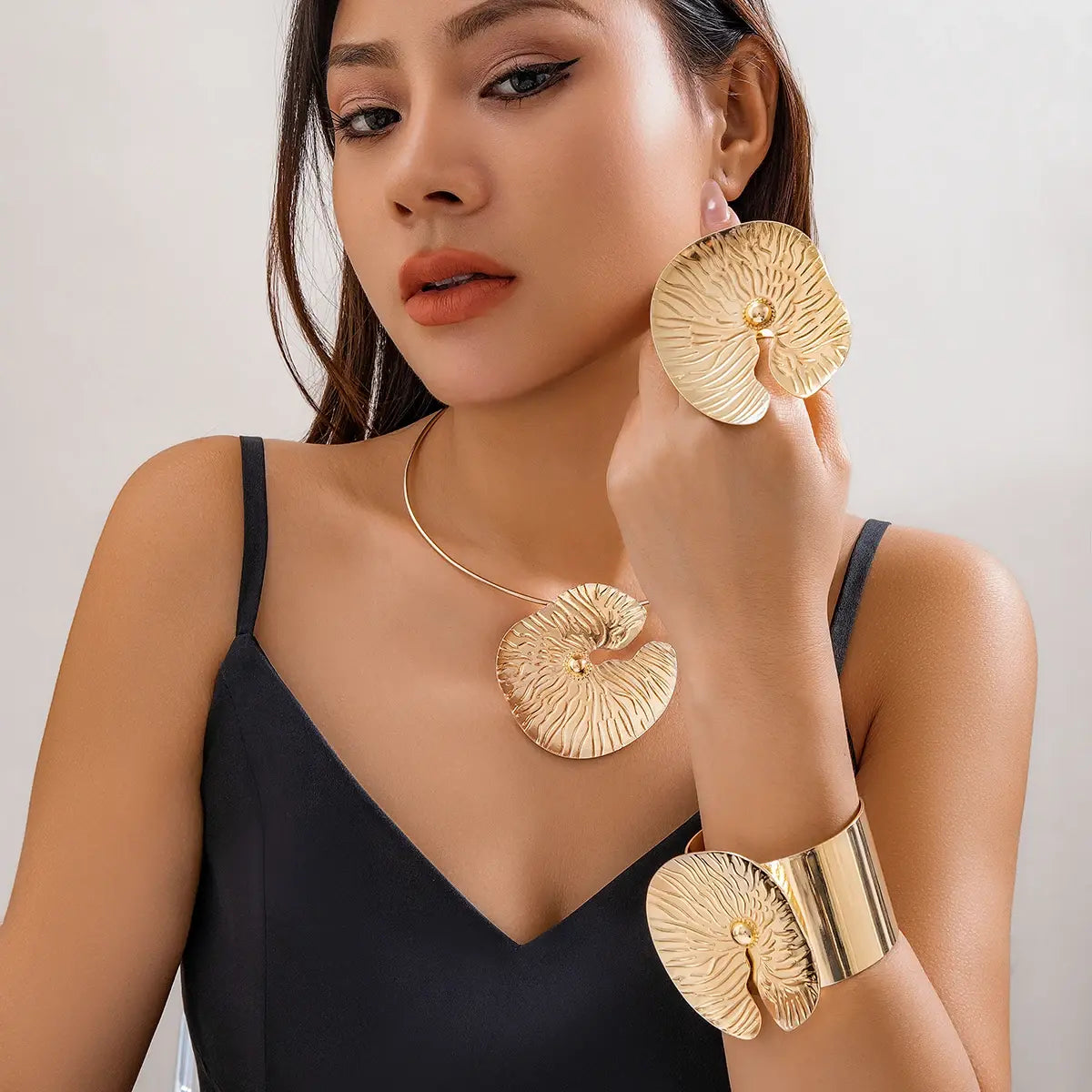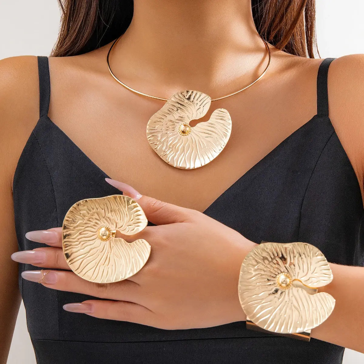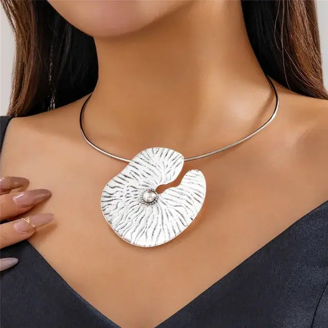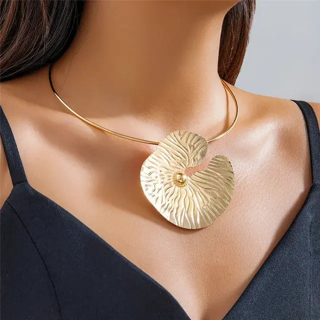 Exaggerated Lotus Leaf Adjustable Torques Choker Necklace: This piece of geometric chain jewelry is crafted from iron metal. It features an adjustable design and a striking lotus leaf pendant.