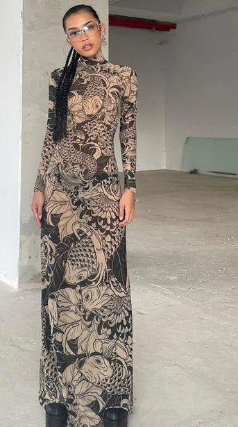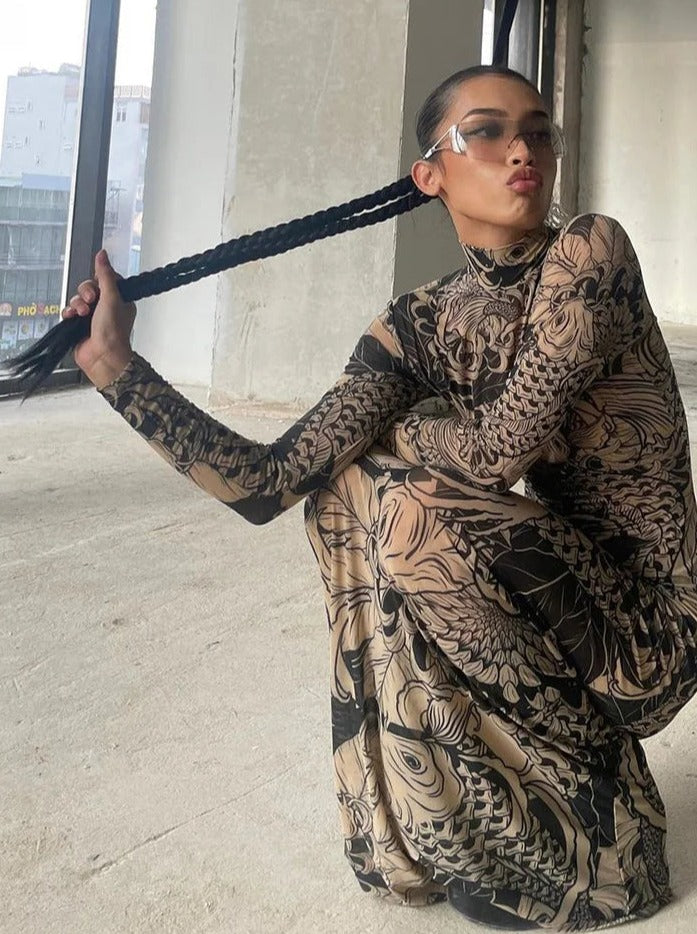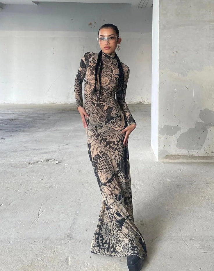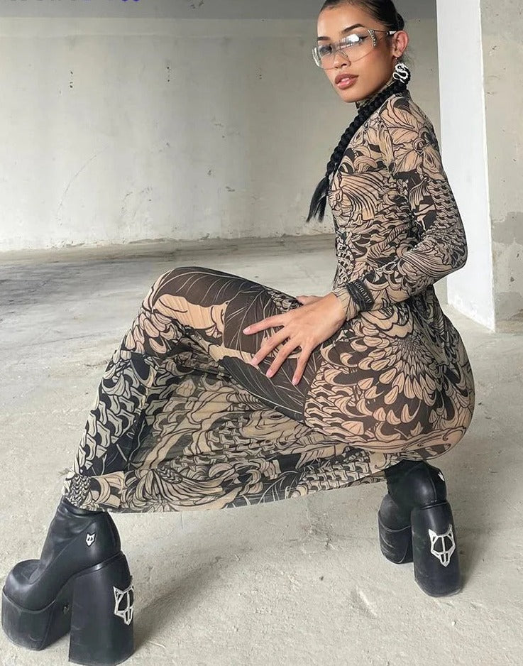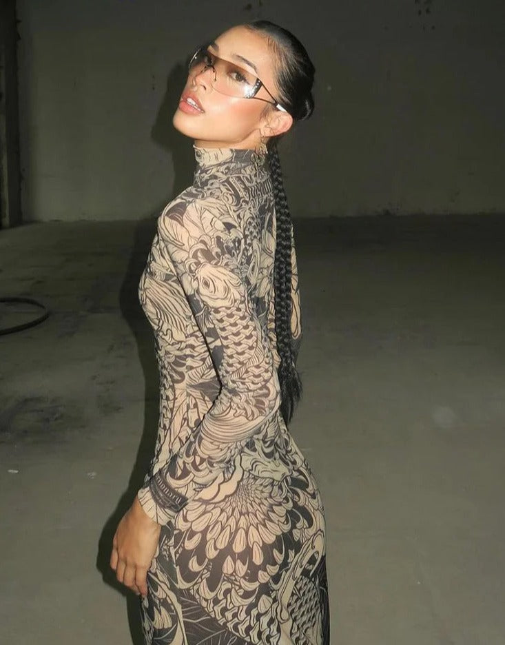 This our San Francisco Summer dress. It's a mesh print maxi dress with a turtleneck, full sleeves, and bodycon fit. The body-hugging silhouette will enhance your natural curves. This dress captures the vibrant and eclectic essence of San Francisco and high street parties.