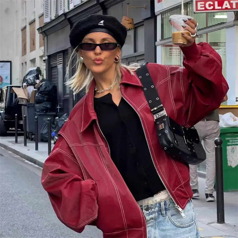 Women's Fashion New Two Tone American Vintage Wine Red Stand up Neck Loose Coat